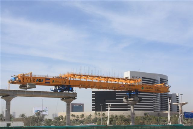 The Dubai Metro Project a US $120 million (AED32.7 million) contract to build a viaduct to carry one part of Dubai’s light rail transit (LRT) system. The VSL unit, which specializes in the construction of bridges, using 9 brand new state of art ‘Deal Overhead Launching Gantries' on the Red Line a 52.1-kilometer (32.4-mile) line with 29 stations from Jebel Ali Port, the American University in Dubai, through the city center, and to the Airport Free Zone. The work, being carried out in a joint venture with the French counterpart of VSL Freyssinet International and Italian-based Rizzani de Eccher and will result in two separate lines. The contract includes to build a viaduct on a second LRT line, the Green Line a 20-kilometer (12.4-mile) line with 22 stations from Festival City, through the city center, and the Dubai International Airport Terminals 1 and 3, to Rashidiya.. The red and green line together have a length of approximate 70 km.