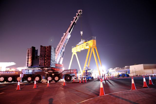 The yard had a capacity to store up to 2,500 of those concrete segments and 9 Tower Cranes and 11 Gantry Cranes was erected under my supervision to carry out the work and storage. The segments where moved from the Jebel Ali Yard to the erection site with 44 No. of special heavy weight trailers.