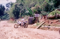 Because driving on the big roads isn't so exciting I tried all the time driving on small roads. One story happened on the way to Utaradit I'll never forget. I drove from Loei in the mountains near the border to Laos up and up and the roads get smaller and smaller. First it was asphalt-roads but this change after a while. Then the last village was also about more than one hour ago when I came to a village were nobody stayed and a lot of the houses was burned and it was like a ghost-town and I got a bad feeling. Actually I got very scared as I saw after the village on the roadside a few guys standing with loincloth and Thai-turban and there had very old gun's with so a long barrel.